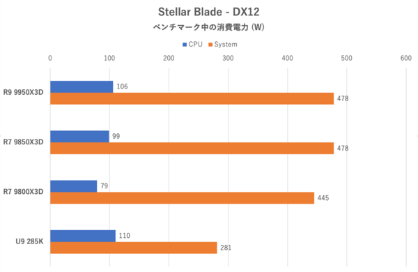 消費電力の傾向もARC Raidersなどと同じである。Core Ultra 9 285Kにおけるシステム全体の消費電力が低いのは、フレームレートが上がらないため、GPUがサボり気味になっていることを示している。