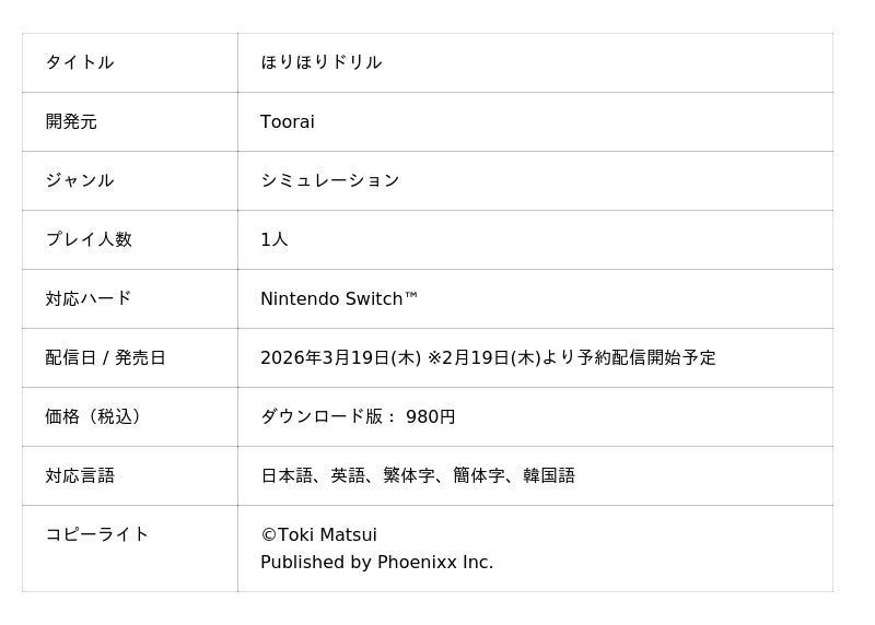 株式会社Phoenixx(フィーニックス)(東京都武蔵野市、代表取締役社長:坂本 和則)は、黙々と遊べる地面採掘、鉱石収集ゲーム『ほりほりドリル』をNintendo Switch(TM)向けに、2月19日(木)より予約受付開始、3月19日(木)より配信開始を決定したことをお知らせいたします。