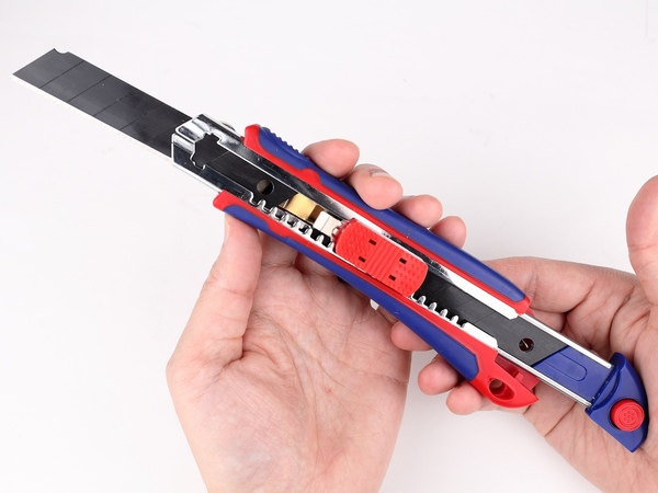 いろいろなカッターナイフが発売されていますが、その多くは、握りやすさや力の入れやすさ、刃の固定方法など、カッターナイフとしての使い勝手を追及しているものです。それに対しこのセーフティロックカッターは、カッターナイフそのものの使い勝手というよりも、使う上で便利になることを重視している、という印象が強いです。
