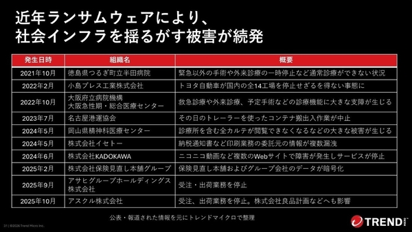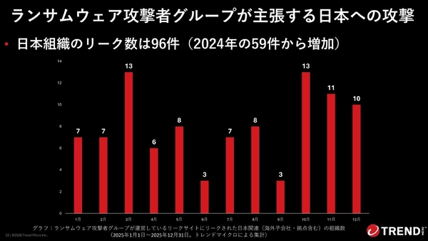 トレンドマイクロが集計した、2025年の国内のランサムウエア被害公表数は87件と、2024年の98件より減少。一方で、日本組織の暴露サイトでのリーク数は96件で、2024年の59件から増加している。ただ、世界全体でのリーク数は7759件で、実は日本の数字は1.2%に過ぎない。岡本氏は、「日本が標的にされているイメージもあるが、世界からみるとほんの一部」だと語る。