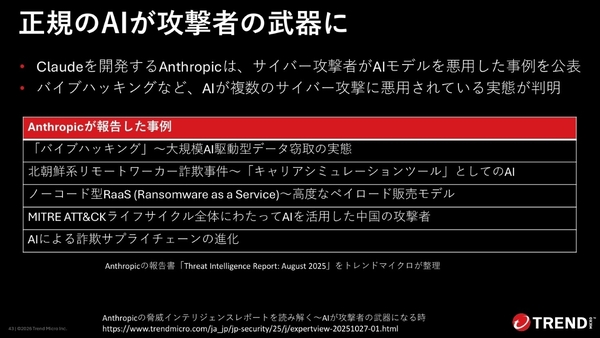 攻撃者が悪用するためのLLMも、これまで、WormGPTやKawaiiGPT、Xanthoroxなどが登場している。さらに2025年は、正規のLLMを悪用する手法がアンダーグラウンドで活発に議論された。実際にClaudeを開発するAnthropicは、LLMを悪用した複数の事例を公表。中国の攻撃者が、攻撃をほぼ自動化した例も存在するという。