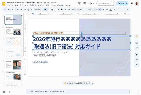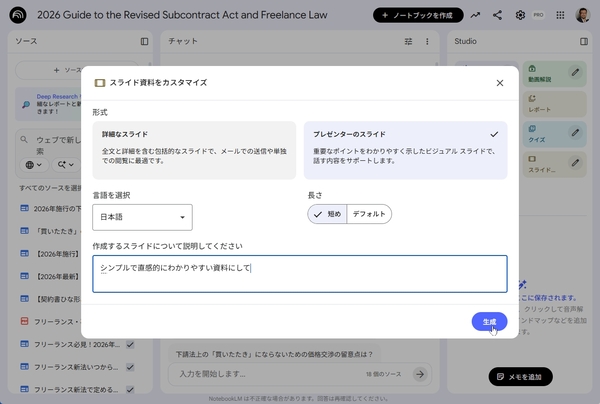 この単純な工程を一つ挟むだけで、生成されるアウトプットの質は大きく変わる。例えば、社内回覧用の資料であれば「詳細なスライド」を選ぶことで、説明文が充実した、独り歩きしても理解されるスライドが生成される。一方、登壇用であれば「プレゼンターのスライド」を選ぶことで、聴衆の視線を奪わない、要点を絞ったシンプルな構成が手に入る。
