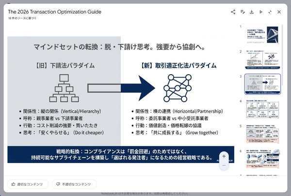 昨年11月、このNotebookLMにスライド作成機能が実装された。ビジネスの現場における資料作成の時間を劇的に短縮するポテンシャルを秘めているが、多くのユーザーは「ソースを選択してボタンを押すだけ」という初歩的な使い方に留まり、生成されるスライドの質の低さや、PDFでしか出力できないという仕様の壁に直面して離脱してしまっているのが現状だ。