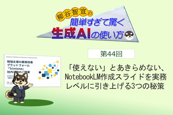 本連載は生成AIをこれから活用しようとしている方たちのために、生成AIの基本やコピペしてそのまま使えるプロンプトなどを紹介。兎にも角にも生成AIに触り始めることで、AIに対する理解を深め、AIスキルを身に着けて欲しい。第44回は「NotebookLM」で作成するスライドを実務で使えるようにする3つの方法を解説する。