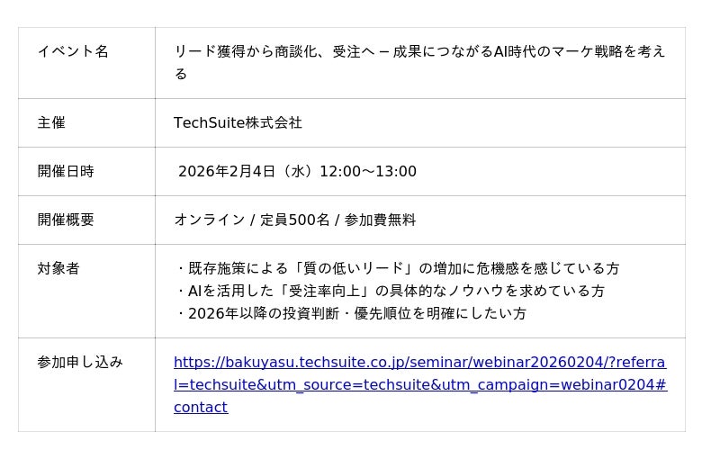 TechSuite株式会社(テックスイート/代表取締役: 畠山夏輝)は、2026年2月4日(水)に、オンラインウェビナー「リード獲得から商談化、受注へ ─ 成果につながるAI時代のマーケ戦略を考える」を開催します。