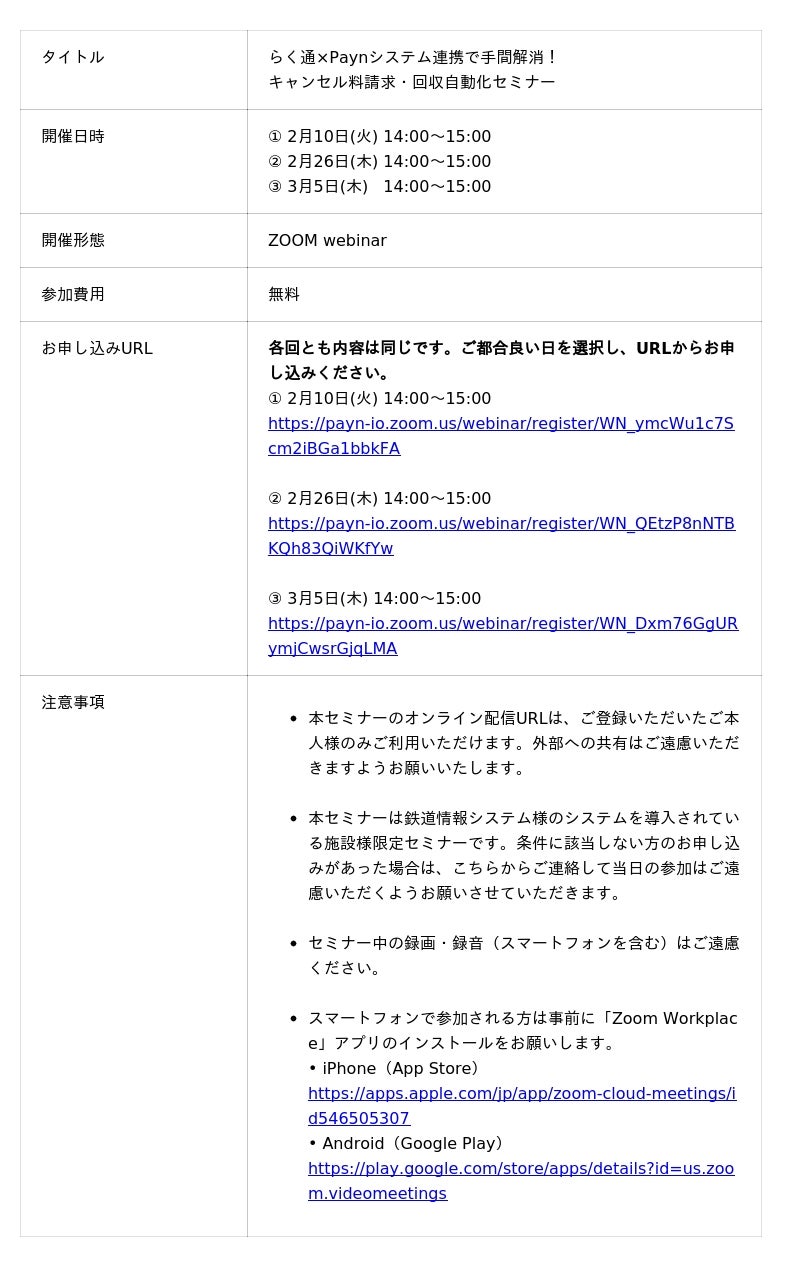 キャンセル料の請求・回収業務を自動化する「Payn(ペイン)」を提供するPayn株式会社(本社:東京都中央区、代表取締役CEO:山下恭平、以下「当社」)は、予約サイト一元管理システム「らく通with」を提供する鉄道情報システム株式会社(本社:東京都渋谷区、代表取締役社長:池田 孝行、以下「JRシステム」)とAPIを活用したシステム連携を実現しました。