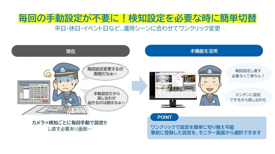 イベント開催時、祝祭日、夜間など、施設の利用状況に応じた検知ルールを保存し、ワンクリックで切り替え可能な「設定保存機能」を新たに搭載しました。