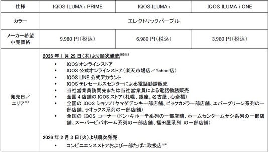 ※1 2025年12月16日(火)より、免税店(成田国際空港、東京国際空港〔羽田〕、関西国際空港、中部国際空港、福岡空港、新千歳空港、沖縄那覇空港〔国際線のみ〕、ロッテ免税店東京銀座店、Japan Duty Free GINZA)においては、「IQOS ILUMA i PRIME エレクトリックパープル」、「IQOS ILUMA i ONE エレクトリックパープル」のみ順次発売を開始しております。