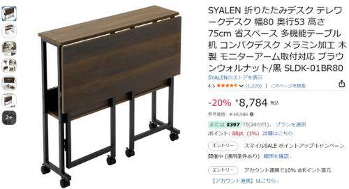 SYALEN 折りたたみデスク「SLDK-01BR80」が、Amazonで割引表示されています。参考価格10,980円のところ、20%オフの8,784円で販売中です。