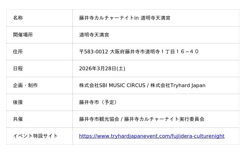 株式会社SBI MUSIC CIRCUS、(本社:東京都港区、代表取締役社長:大付 楽洋、以下「当社」)は、藤井寺市観光協会および藤井寺カルチャーナイト実行委員会とともに、2026年3月28日(土)、大阪府藤井寺市の歴史的文化資源である道明寺天満宮にて、「藤井寺カルチャーナイト in 道明寺天満宮」を初開催いたします。