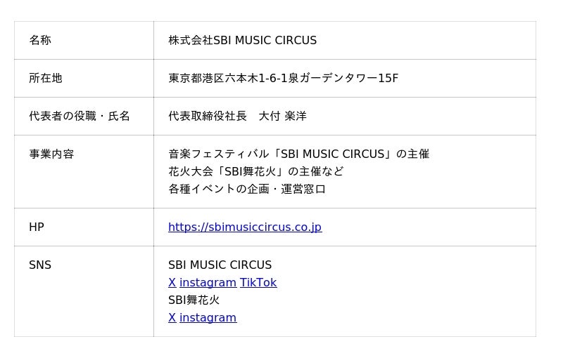 株式会社SBI MUSIC CIRCUS株式会社SBI MUSIC CIRCUSは、音楽の力と文化産業を融合させ、その地域と訪問者の双方に魅力的なコミュニティを提供します。