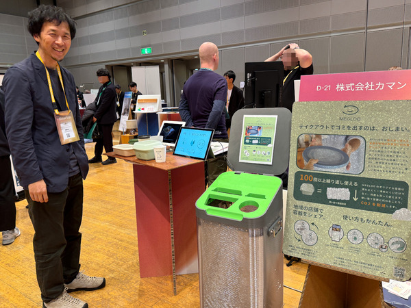 株式会社カマンが展示していたのは、「捨てない前提」で使うリユース容器と、その回収と管理まで含めた運用システムだ。