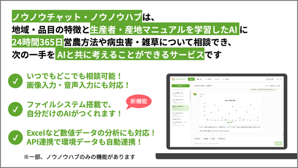 「ノウノウチャット・ノウノウハブ(AI相談・データ管理・栽培管理)」は、農業に関する相談が24時間365日可能なAIチャットによる対話型サービス。地域や品目などの前提条件に応じた回答最適化を行い、日々の営農判断を支援する。