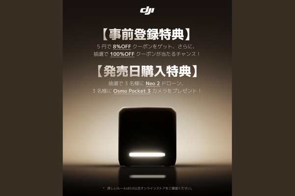 製品名や価格は不明だが、事前登録(5円)で8%OFFクーポンが、発売日購入特典として、抽選でドローンやOsmo Pocket 3が当たる。詳細は公式ページで。
