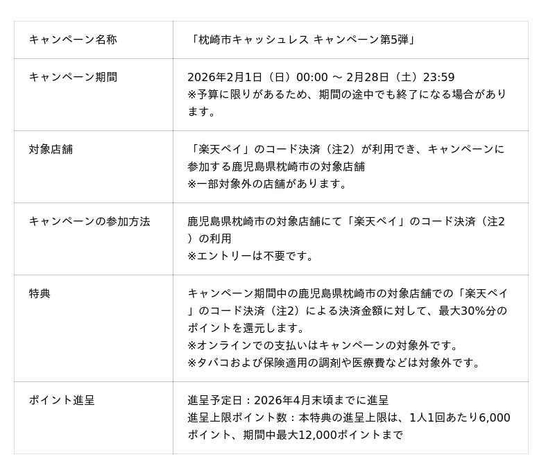楽天ペイメント株式会社(以下「楽天ペイメント」)は、運営するキャッシュレス決済サービス「楽天ペイ」において、鹿児島県枕崎市が2026年2月1日(日)から2月28日(土)まで実施する「枕崎市キャッシュレス キャンペーン第5弾」に参加することをお知らせします。