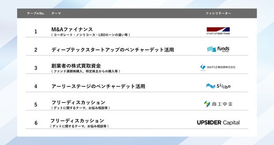 今回は「ベンチャーデットの真実と新潮流」をテーマとし、最新の活用事例や実務上の論点など実践に直結する知見を共有します。参加金融機関ラインナップを前回より拡大するほか、スタートアップと金融機関が直接意見交換できるラウンドテーブルを新たに導入。スタートアップの皆様により深く具体的な情報をお届けします。