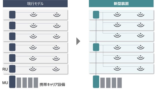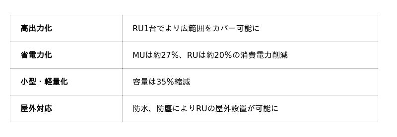 ・ 電波の出力を高めることで、RU1台でより広範囲をカバーでき、装置数を削減できる。