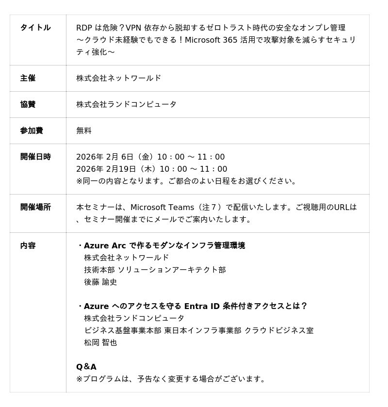 2026年2月6日(金)と2月19日(木)の2回、株式会社ランドコンピュータ(本社:東京都港区)は、Webセミナー「RDP は危険?VPN 依存から脱却するゼロトラスト時代の安全なオンプレ管理~クラウド未経験でもできる!Microsoft 365 活用で攻撃対象を減らすセキュリティ強化~」を共催いたします。