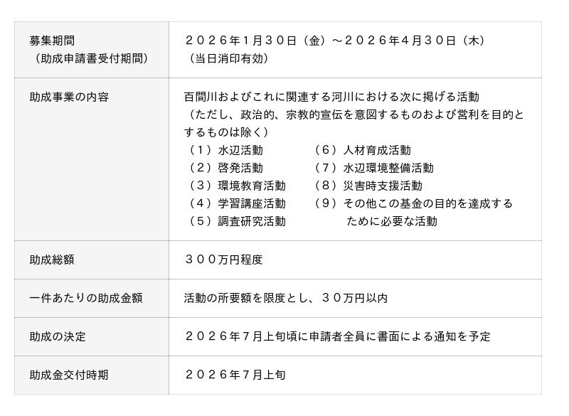 中国銀行(岡山市 頭取 加藤 貞則)では、公益信託『百間川』水とみどり基金の運営をおこなっております。当基金では、百間川およびその周辺の良好な水辺空間の形成が図られることを目的として、このたび第24回目の助成先の募集を、下記のとおりおこないます。みなさまからの多数のご応募をお待ちしております。