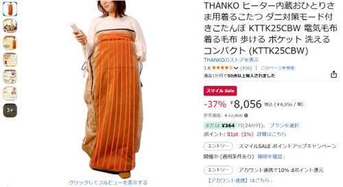 THANKOのヒーター内蔵おひとりさま用着るこたつ「こたんぽ(KTTK25CBW)」が、Amazonスマイルセールの対象になっています。参考価格12,800円のところ、37%オフの8,056円で販売中です。