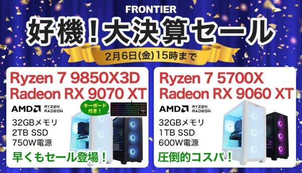FRONTIER、大決算セール開催! Ryzen 7 9850X3D×RX 9070 XT搭載ゲーミングPCが特価