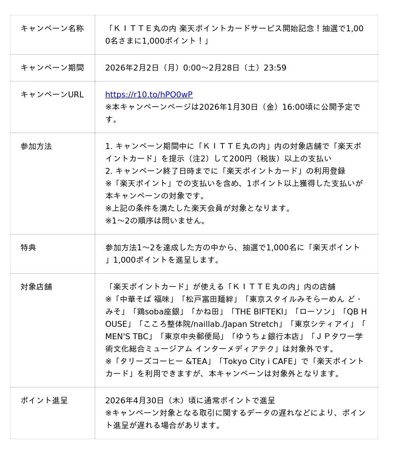 本導入を記念して、2026年2月2日(月)から2月28日(土)まで、「KITTE丸の内 楽天ポイントカードサービス開始記念!抽選で1,000名さまに1,000ポイント!」キャンペーンを実施します。