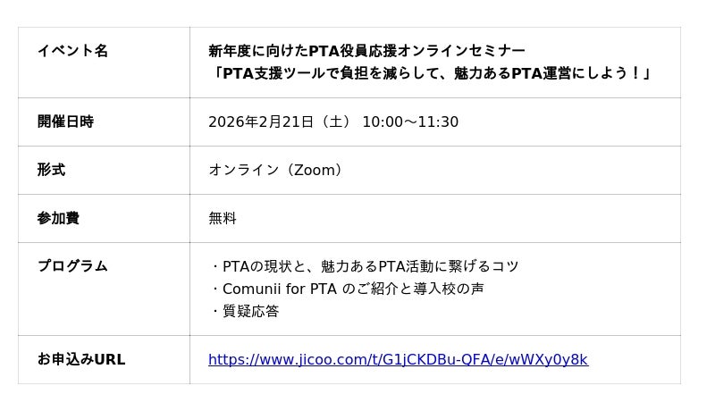 株式会社Comunii(読み方:コミュニー、本社:東京都千代田区、代表取締役CEO:上田 真実子、以下「当社」)は、来年度のPTA役員に就任予定の方々を対象とした応援イベントを、2026年2月21日(土)にオンライン開催いたします。