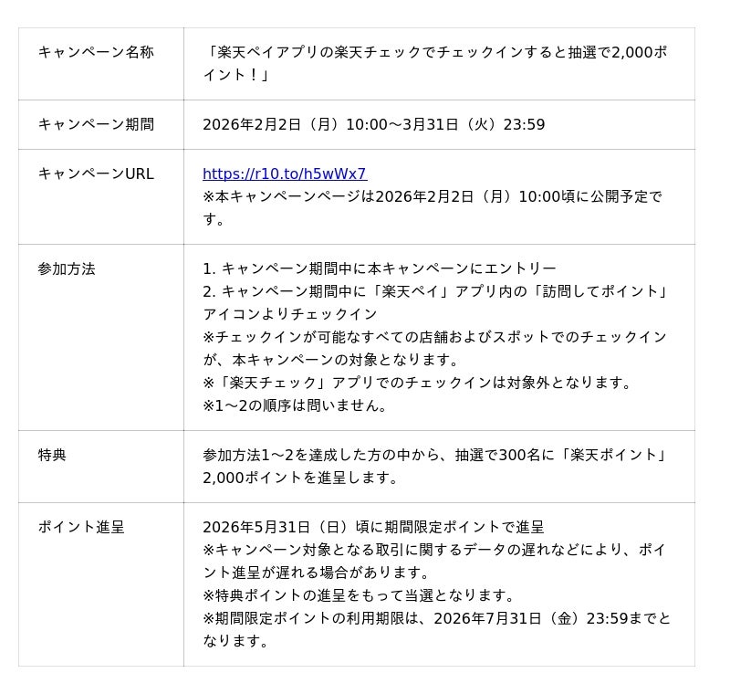 楽天ペイメント株式会社(以下「楽天ペイメント」)は、キャッシュレス決済サービス「楽天ペイ」アプリにおいて、「訪問してポイント」からチェックインした方を対象に、抽選で「楽天ポイント」2,000ポイントを進呈するキャンペーンを、2026年2月2日(月)から3月31日(火)まで実施することをお知らせします。