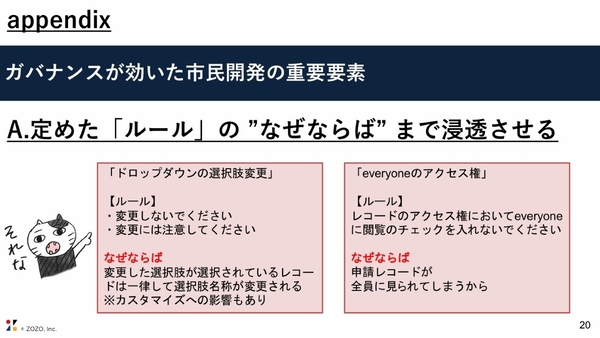 加えて新井氏は、「ルール策定をゴールにせず、“どうして設けられたのか”まで浸透させるのが、市民開発の重要要素」だと語る。例えば、「レコードのアクセス権でeveryoneに閲覧のチェックを入れない」というルールは、申請レコードが全員に見られてしまうからであり、守らないとどうなるかまでを共有する。