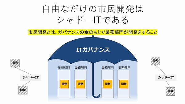 最後に、サイボウズの倉林一範氏は、「市民開発はIT部門と業務部門がそれぞれの責任範囲で協働することが重要」だとまとめる。IT部門は、安全性を担保して、生産性を高められる市民開発の環境を整備する。一方で、業務部門はその環境のもとで、自らの業務を自らの手で改善していく。「プロ開発とは異なり、こと市民開発においては、IT部門は市民開発を促す立場。そして、現場の市民開発者は、ガバナンスの傘の下でルールに則り開発をする」と倉林氏。