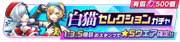 本ガチャから排出される★5ウェアは、上記のキャラクターのウェアのみに。また、本ガチャは有償ジュエル500個限定で5回までまわすことができ、1回目、3回目、5回目のスタンプでは★5ウェアが確定となる。それぞれのキャラクターは限定ウェアも登場する。