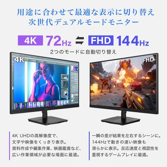 4K(72Hz)とFHD(144Hz)の切り替え可能、常に用途に最適な映像を表示
