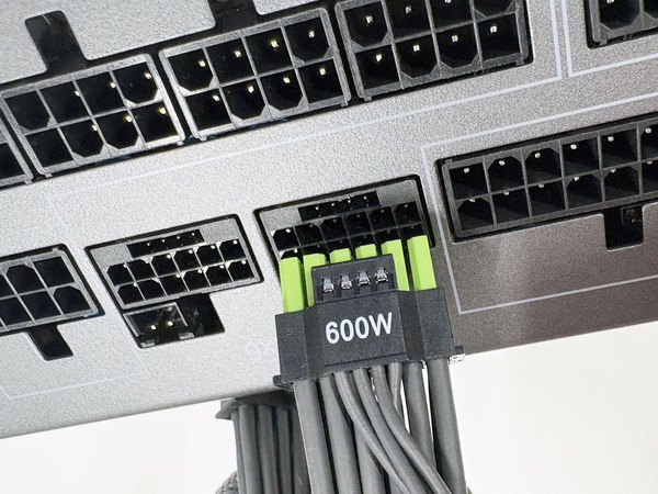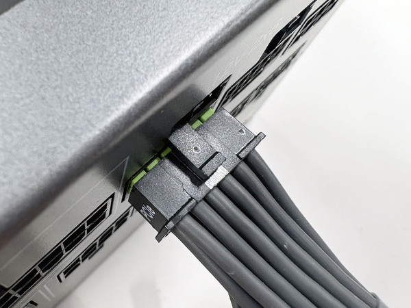色分けは12V-2x6端子を根本までしっかり挿す確認のためだ。ASRock電源ではこの部分をグリーンとしている。端子を正しく挿すことが重要なのは、12V-2x6が最大600Wという大電力を流すケーブルであるためだ。12V-2x6の前身、12VHPWRの時からこの部分の挿し込みが甘かったことによって端子が融解、発火するといった事故がたびたび報告されている。