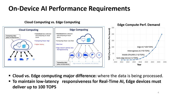 もっともこの100TOPSはSoC全体、つまりCPU+GPU+NPU全部合わせて、という話である。ただこれ、結構に難しい。下の画像の左側は性能に対するトレンドと実際に実現できる性能を示したもので、CPUとGPUに関して言えば、それほど性能には寄与しえない(縦軸が対数軸であることに注意)ので、性能を達成するためにはやはりNPUの性能を引き上げるのが一番得策である。