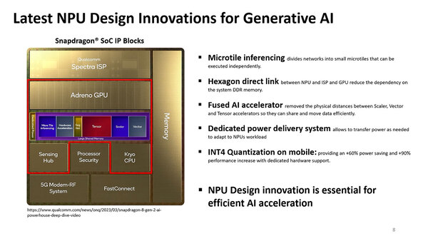 Hexagon NPUは中央に配されている格好だが、以下のようにNPUの性能改善にずいぶん手を打っていることがわかる。
