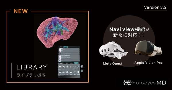 Holoeyes株式会社は1月27日に、医療用画像処理ソフトウェア「Holoeyes MD※」の最新バージョン(Ver. 3.2)をリリースした。このアップデートで、施設を越えて3Dモデルの閲覧を可能にする「Library機能」を実装。同時に、「Navi view機能」のマルチデバイス対応(Apple Vision Pro, Meta Quest等)を拡充した。