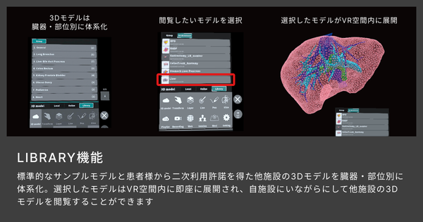 これまで提供していた標準的なサンプルモデルに加え、患者から第三者提供への同意(二次利用許諾)を得た他施設の3Dモデルを、クラウド経由で閲覧可能になった。これにより、より多様な症例の3Dモデルを自施設にいながらにして参照できるとのこと。