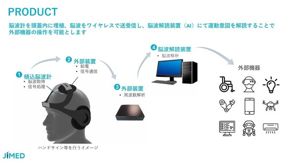 JiMEDは脳波信号で外部機器の操作を可能とするワイヤレス植込型Brain Computer Interface (wiBCI) システムを医療応用することで、考えただけでPCやアシストスーツ等の操作を可能とし、患者さん自身の意思で他者とのコミュニケーション、移動、生活動作の補助などの実現を目指している。