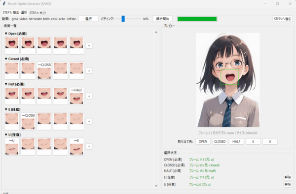 その動画から、「独立した口の画像」と、「口が描かれてない動画」を作る必要があるのですが、手間をかけずにそれをどう手軽に作るのかが課題にもなりました。そこに、カズヤ弟さん(@dodo_ria)が開発した「MouthSpriteExtractor-SAM3」が登場しました。11月にメタが公開したテキスト指定で画面内のものを切り抜ける汎用セグメンテーションモデル「SAM3」を使って、動画から、口だけを抽出するというアプリです。