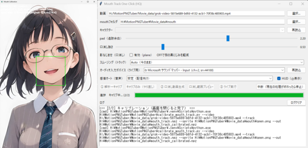 その上で、MotionPNGTuberに、素材とする動画や口の画像を読み込み、キャリブレーションして、また位置調整をします。その上で、画像を重ね合わせても不自然にならないようにするために「口消し動画」を作成し、実際に「ライブ実行」をして、口の画像がリアルタイムに乗せられているか、適切に動いているのかを確認します。