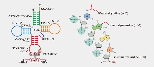 図1 tRNAの構造(左)。折りたたまれてL字型の立体構造をとり、3'末端にアミノ酸が結合し、34、35、36番目の位置にあるアンチコドンが、コドンと呼ばれるmRNA上の3つの塩基の並びと相補的に結合する。右図の赤字部分はRNA修飾の例。上の2つは塩基で修飾が起こり、下の1つはリボースという糖で修飾が起こっている。