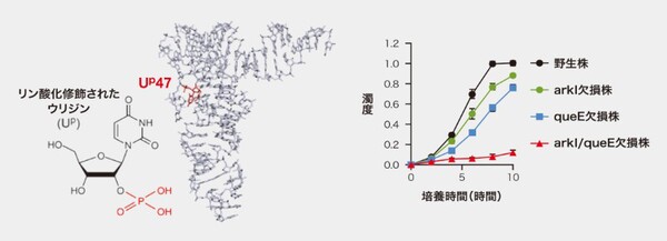 図3 左はリン酸化修飾されたウリジン(Up)の構造と、tRNAにおける位置(Up47)。右のグラフは、87度におけるアーキアの耐熱性を調べた実験結果。縦軸の単位は、波長660ナノ(ナノは10億分の1)メートルの光で測定した濁度。Upを作り出す修飾酵素の遺伝子(arkI)と、tRNAの構造に剛直性を与える遺伝子(queE)の両方が欠損した株では高温での生存率が著しく低下した。