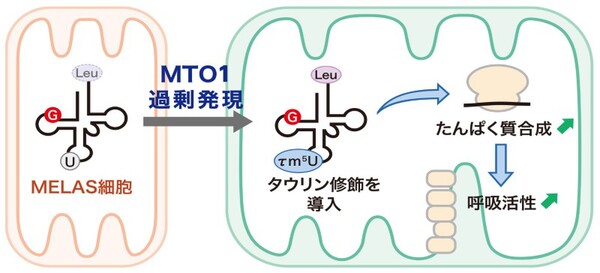健常者ではMTO1と呼ばれる酵素によってtRNAのウリジンにタウリン修飾が起こる。しかしMELAS病患者では、tRNAのアデニンであるべき塩基がグアニンに変化しているため、MTO1がtRNAを認識できず、ウリジンにタウリン修飾が起こらない。鈴木さんらはMTO1を過剰に発現させて細胞内で大量に作らせることで、tRNAのタウリン修飾を回復し、細胞のたんぱく質合成および呼吸活性が向上することを示した(図5)。