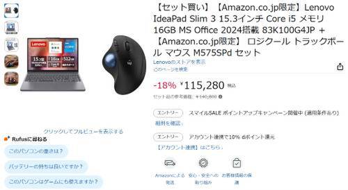 【Amazonで18%オフ】【セット買い】Lenovo IdeaPad Slim 3 15.3インチ(83K100G4JP)+ロジクール トラックボール マウス(M575SPd)をチェック!
