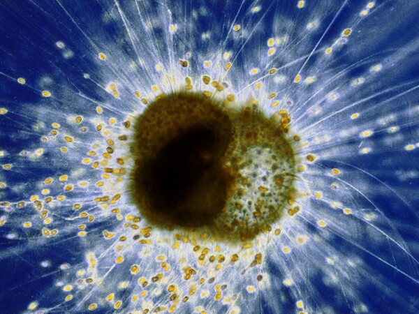 多くの有孔虫は細胞内に微細藻類をすまわせています。宿主の有孔虫も共生藻もそれぞれ単細胞でありながら、共生藻は光合成で作った有機物を有孔虫に渡し、有孔虫は代謝産物を共生藻に提供する光共生の関係を築いています。