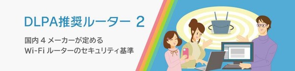 「DLPA 推奨ルーター 2」は、DLPA加盟の4社(株式会社アイ・オー・データ機器、NEC プラットフォームズ株式会社、株式会社エレコム、株式会社バッファロー)が定めるWi- Fiルーターのセキュリティ基準。今後4社が発売する家庭用Wi-Fiルーターは、原則この基準を満たしている。