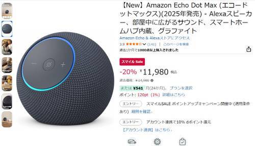 Echo Dot Max(2025年発売)が、Amazonのスマイルセール対象になっています。過去価格14,980円のところ、20%オフの11,980円で販売中です。