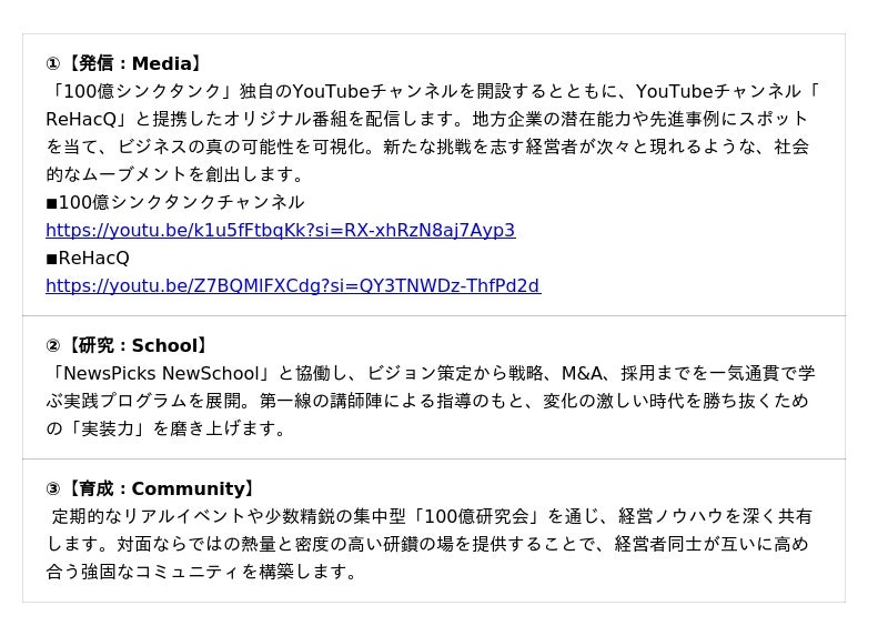 100億シンクタンクは、地方企業の売上100億円達成を支援する知と実践のコミュニティです。単なる知識提供に留まらず、経営者や有識者が現場に基づく成長モデルを共創する「実装プラットフォーム」を3軸で展開します。