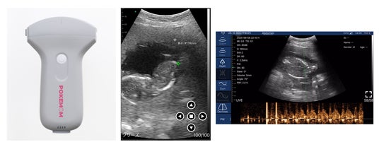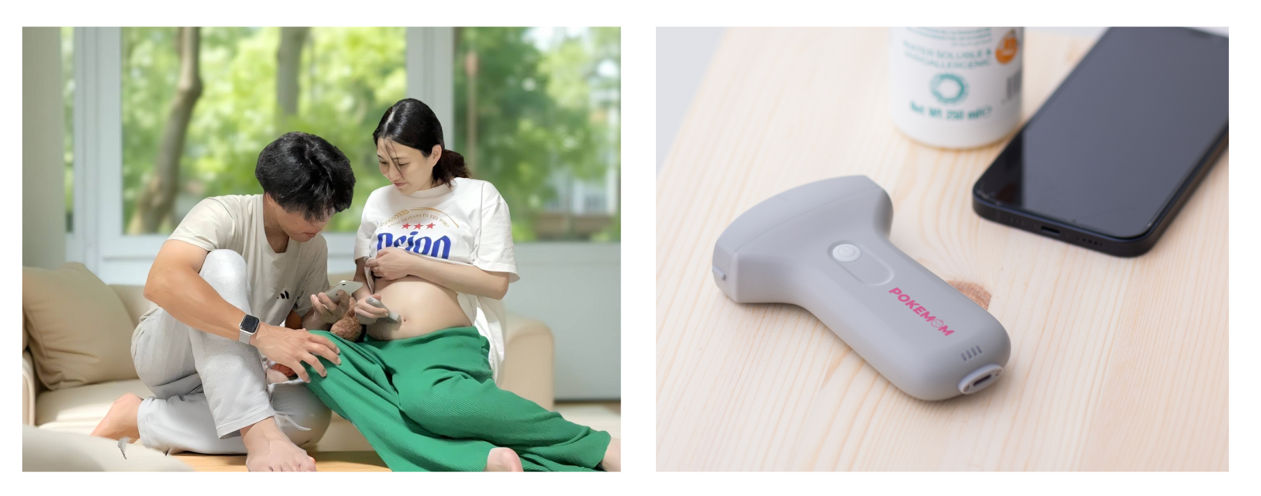 ▲実際に超音波エコーを使う妊婦さんとパートナーさん(左)、ポケマムサウンズ本体(右)