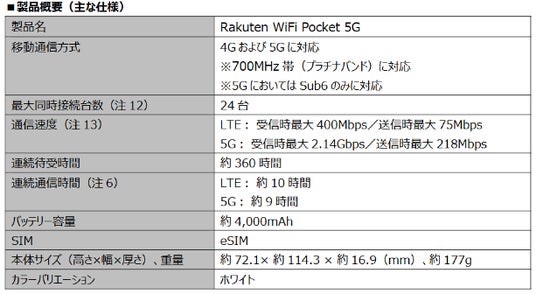 楽天モバイル株式会社(以下「楽天モバイル」)は、5G通信に対応したオリジナルモバイルWi-Fiルーター「Rakuten WiFi Pocket 5G」(以下「本製品」)を、「楽天モバイル」公式サイトおよび「楽天モバイルショップ」にて本年3月頃より発売します(注1、2)。